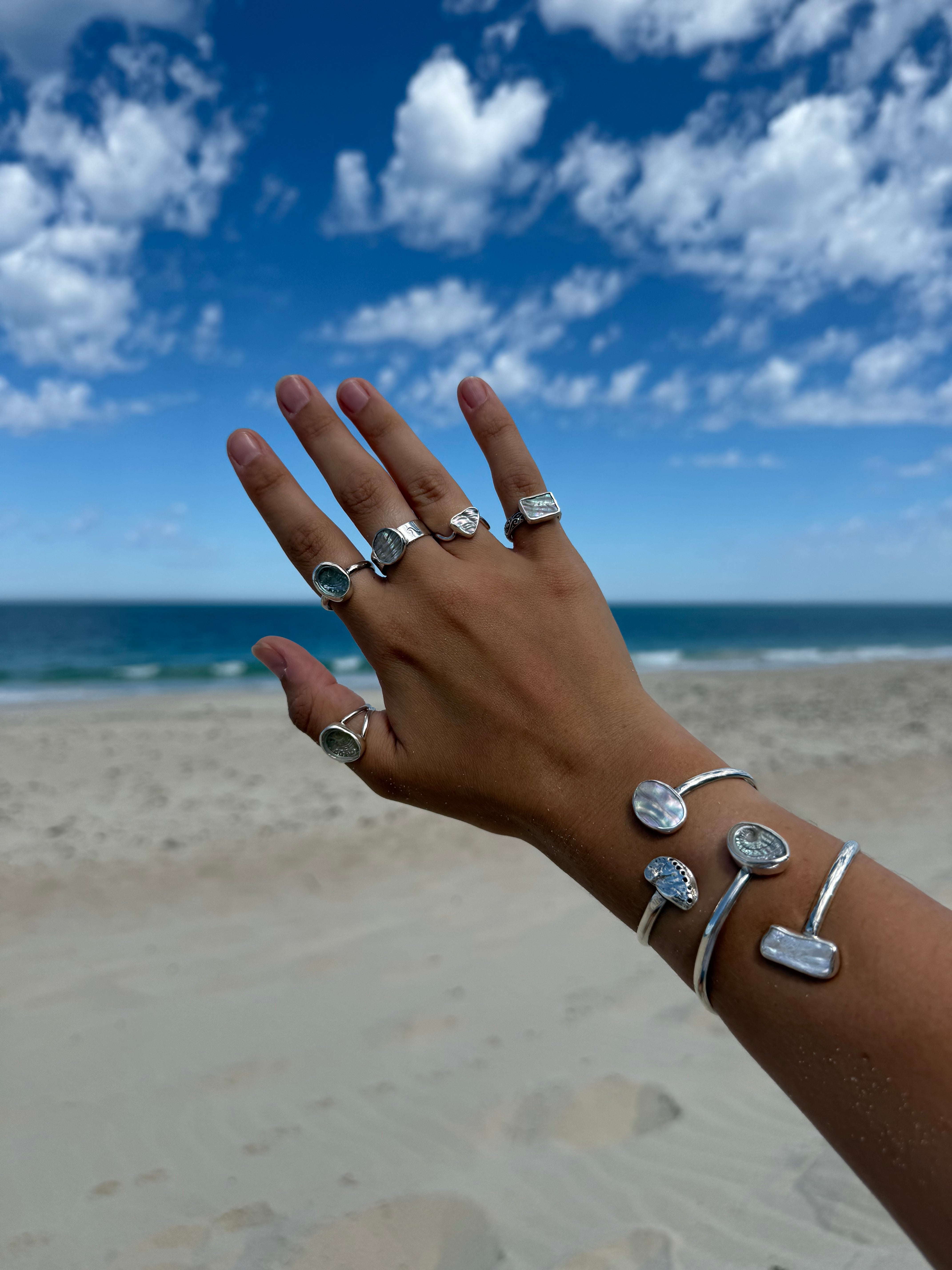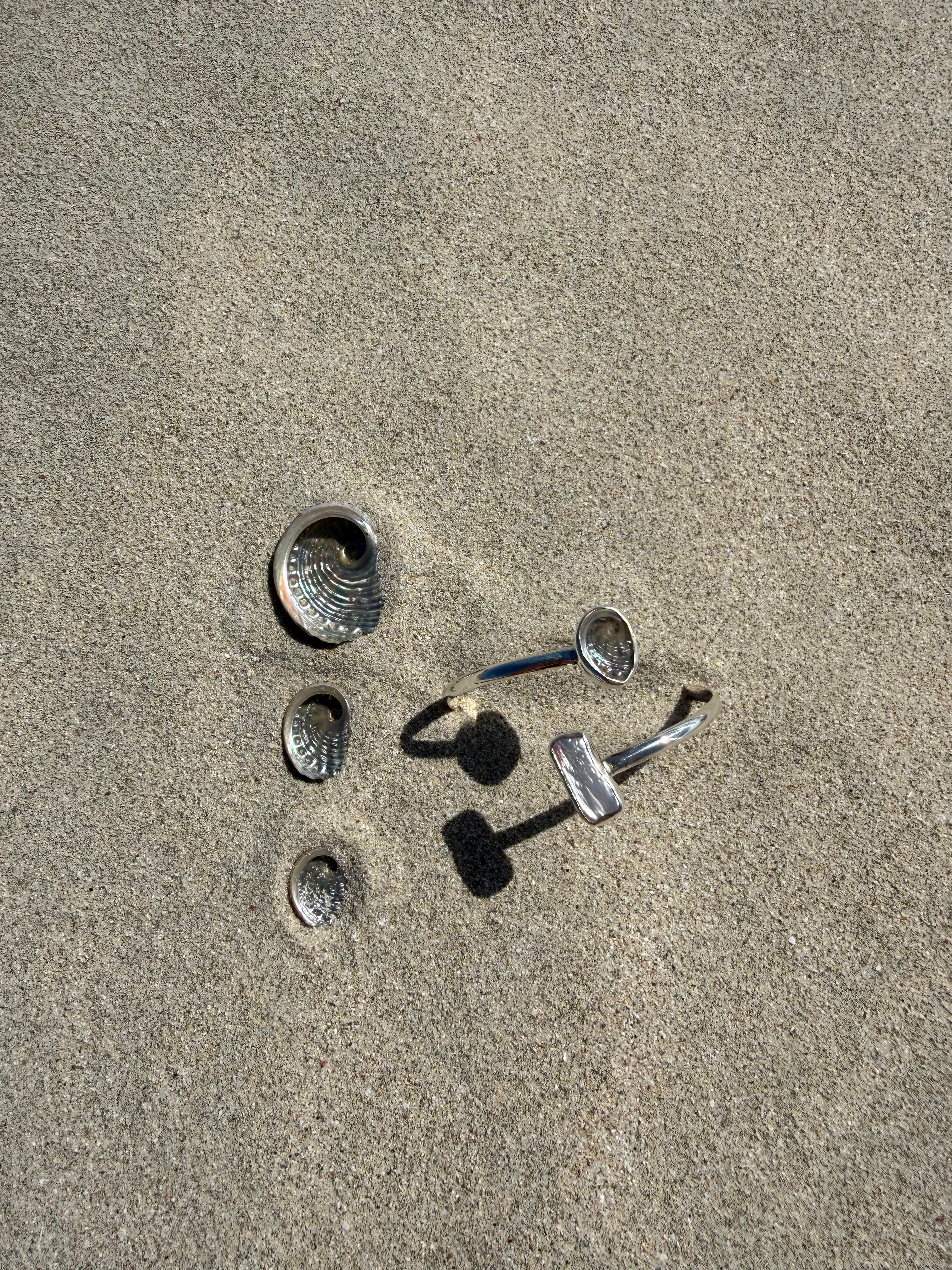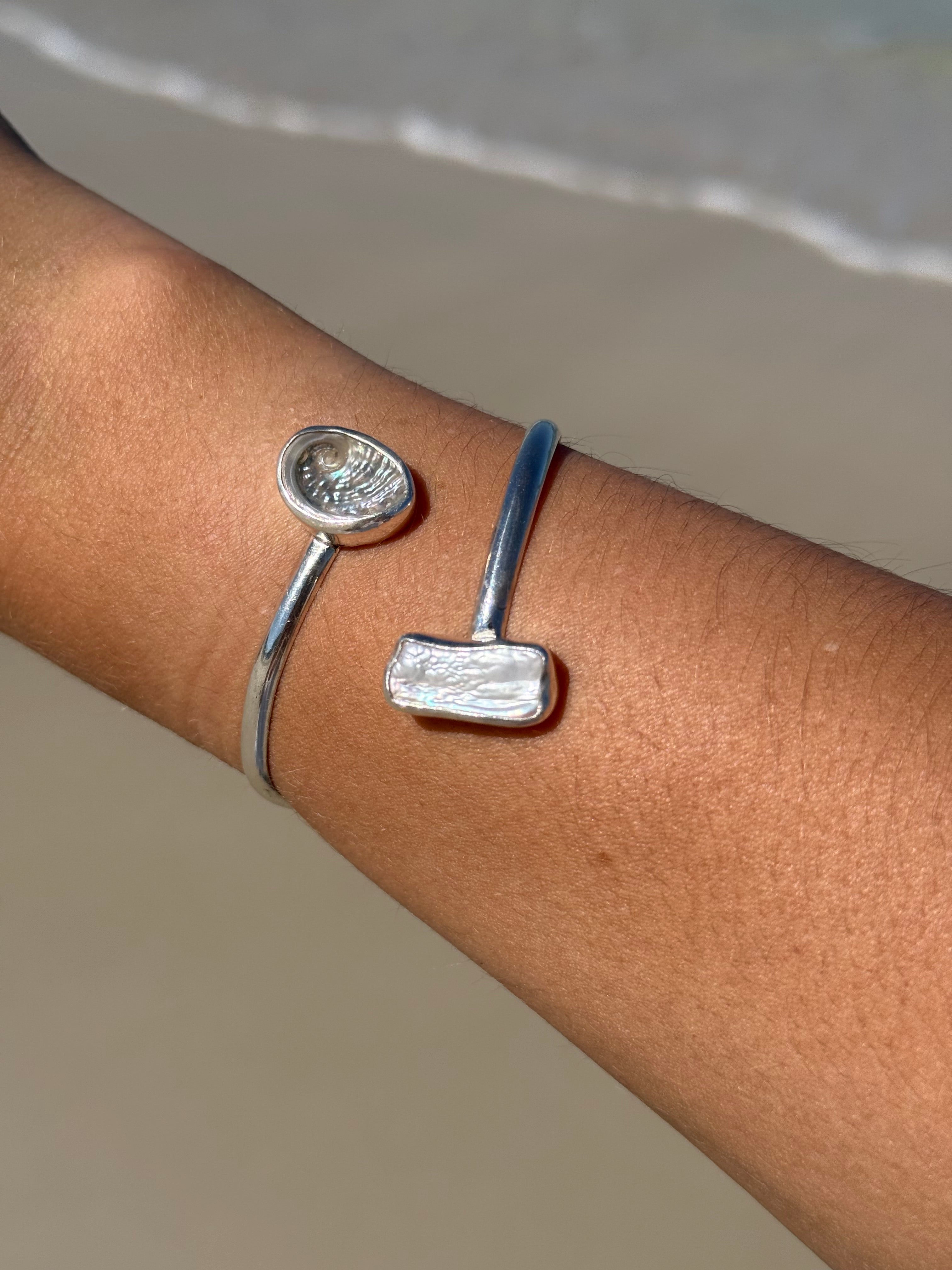 Handmade from 925 Sterling Silver, this open style cuff features a stunning baby abalone & rectangular keshi pearl, both encased in a sterling silver bezel.