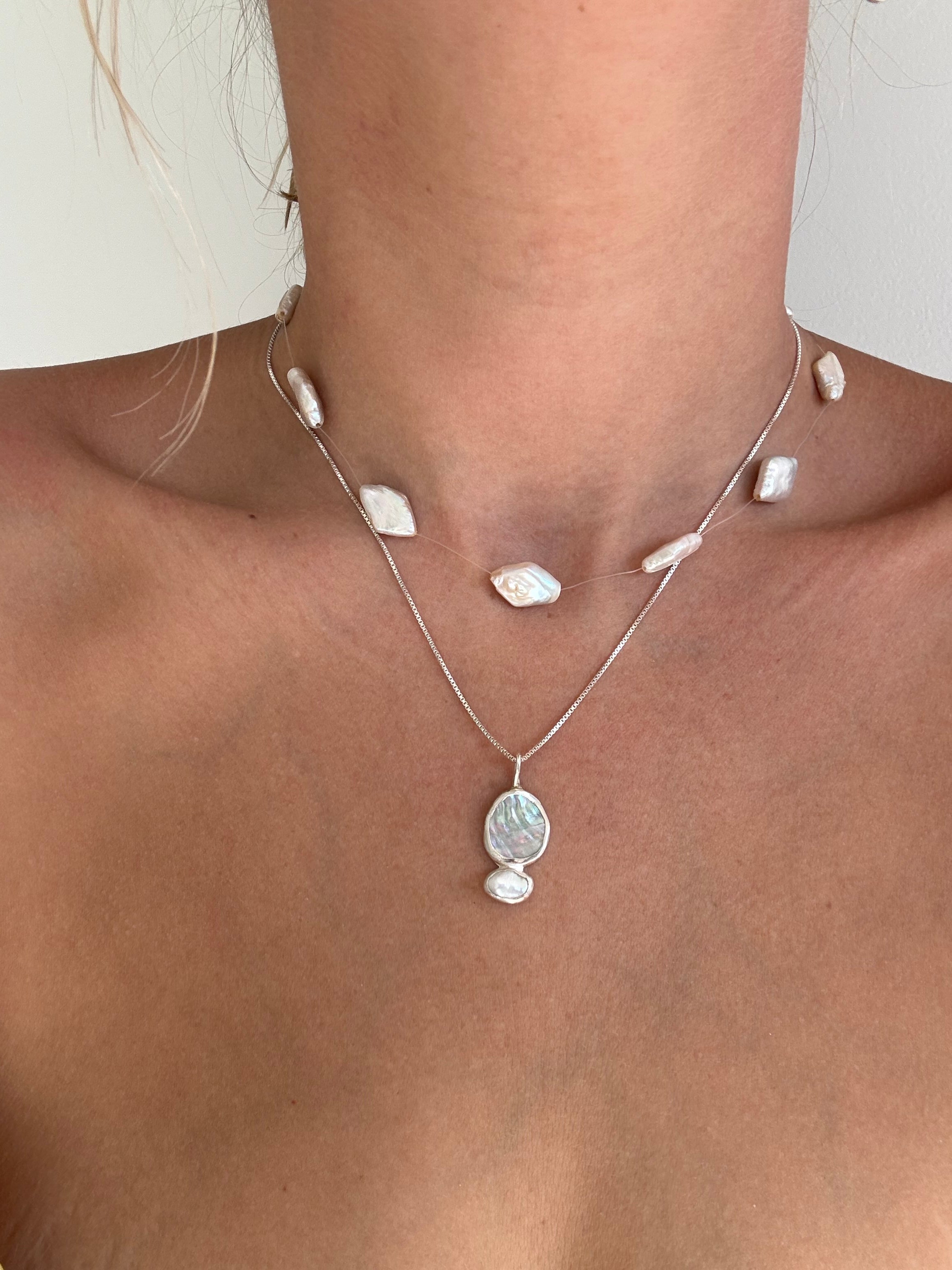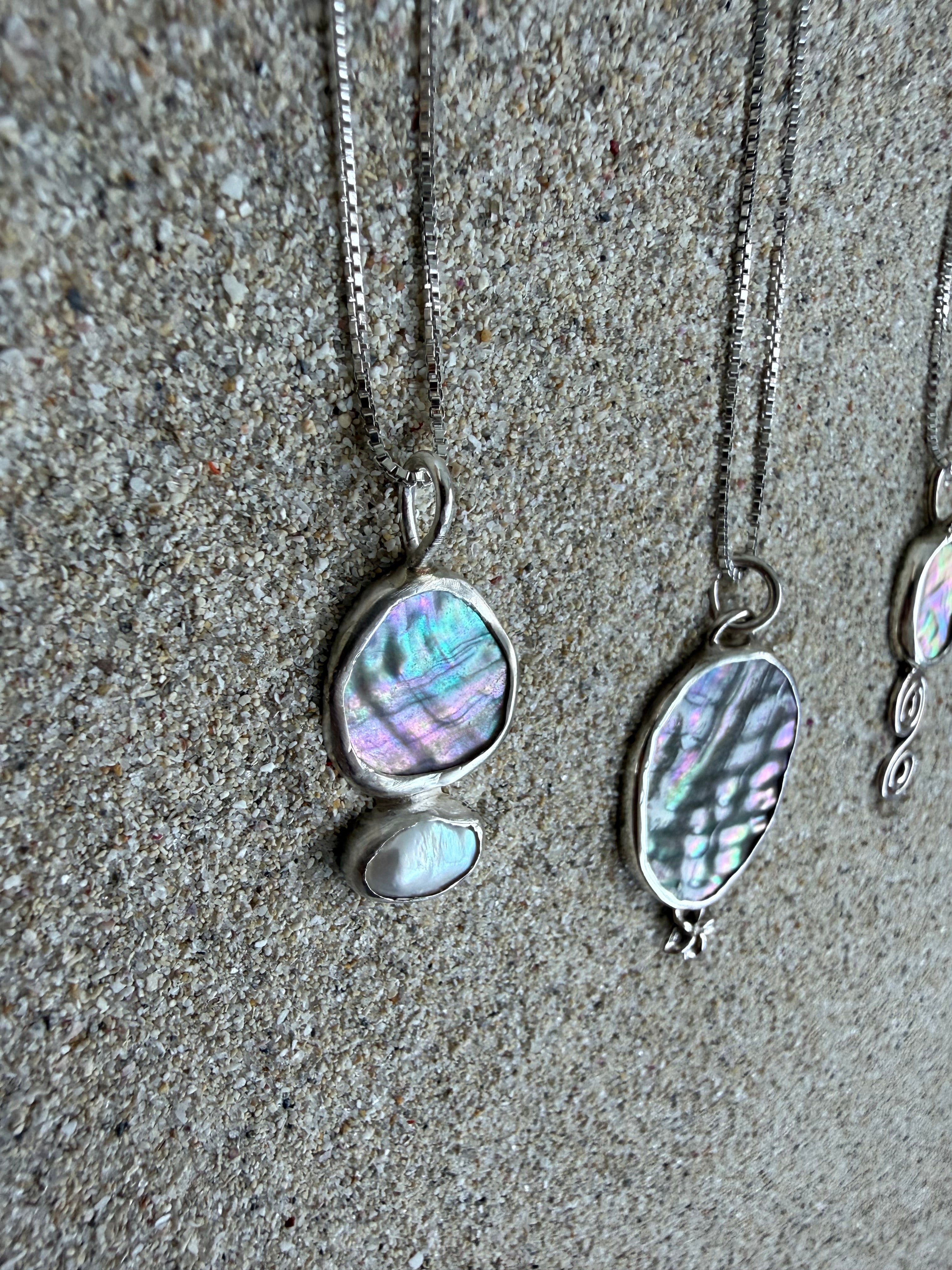 This stunning pendant has been handmade using 925 Sterling Silver featuring a stunning fragment of abalone shell with a petit freshwater pearl beneath.