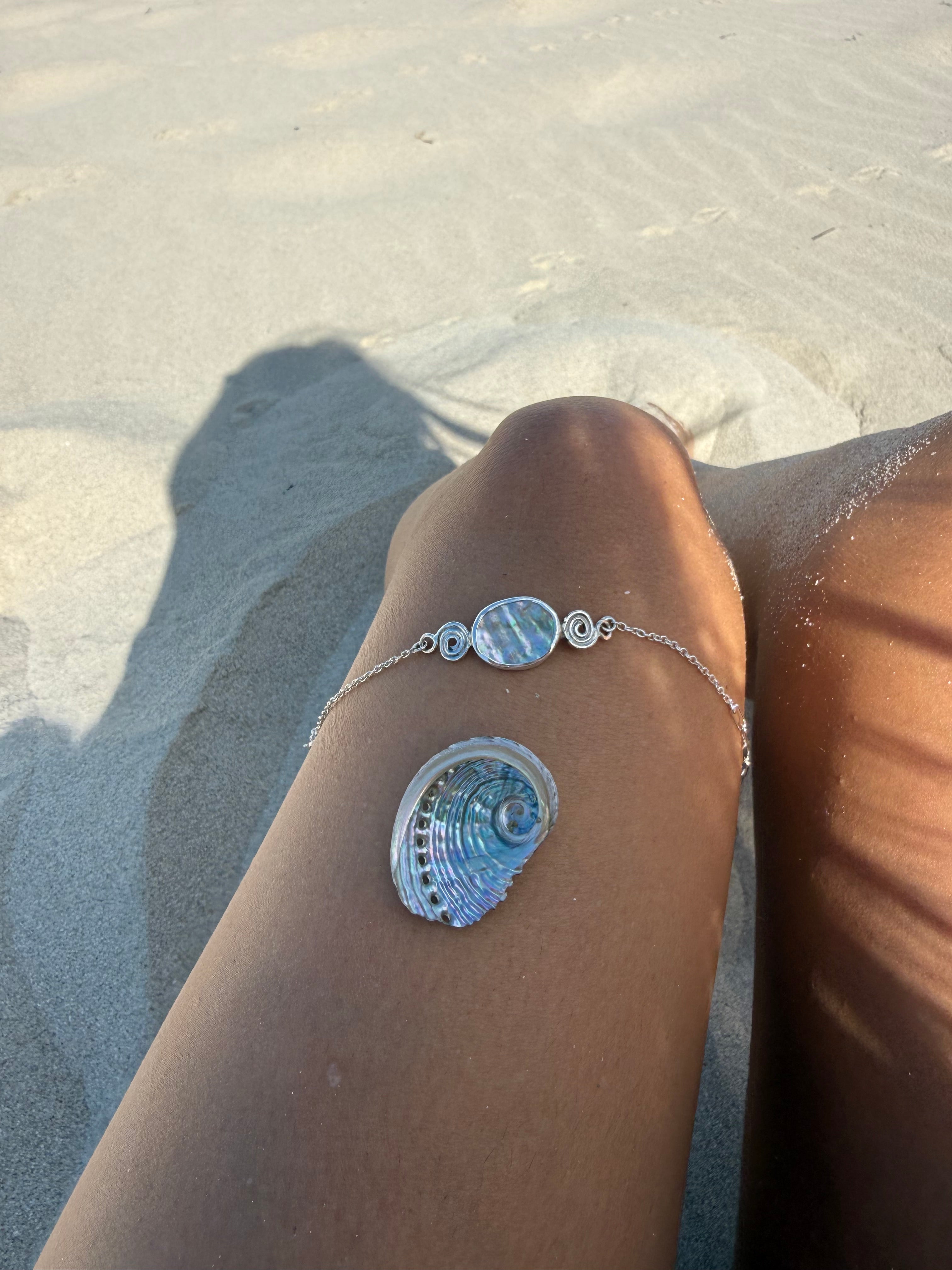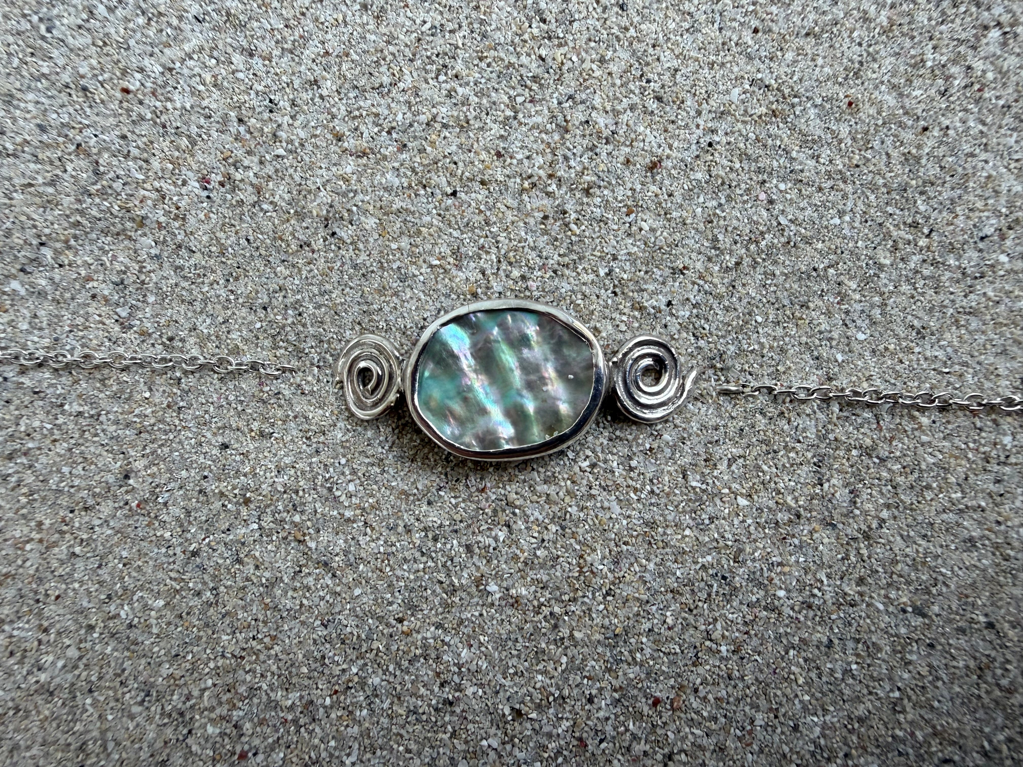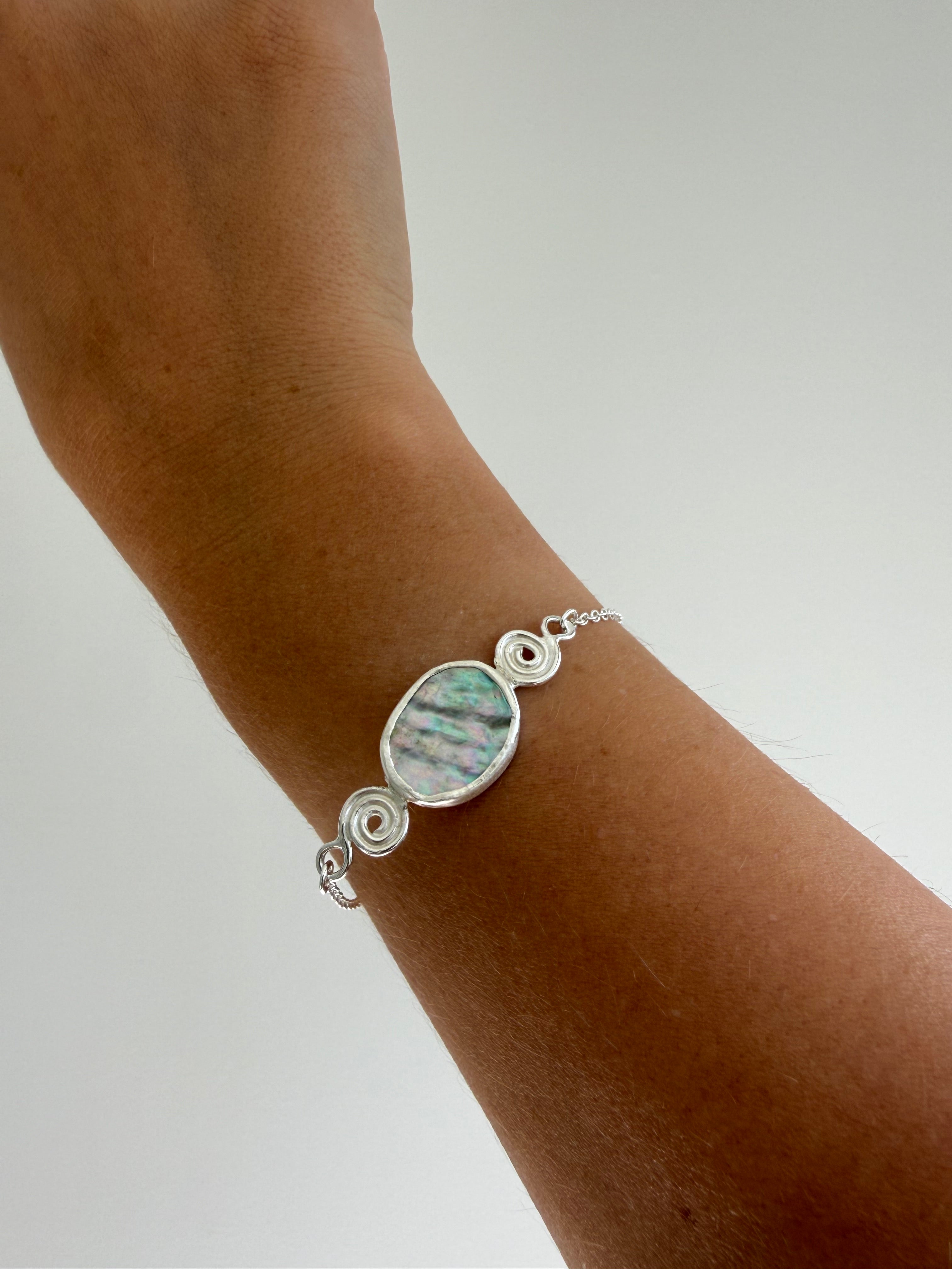 Handmade from 925 Sterling Silver, this bracelet features a stunning abalone shell fragment, surrounded by 2 handformed swirls attached a delicate but strong chain.