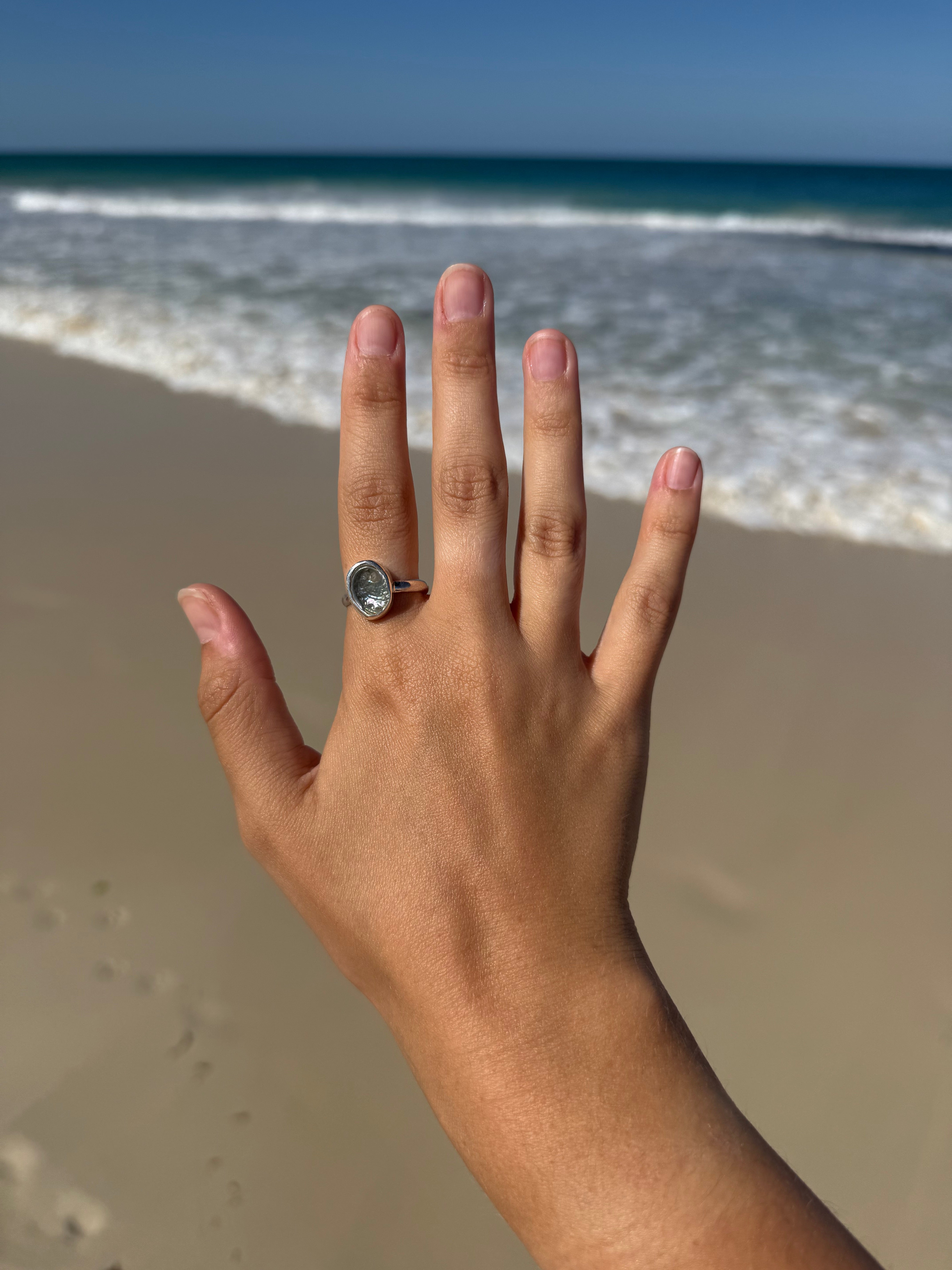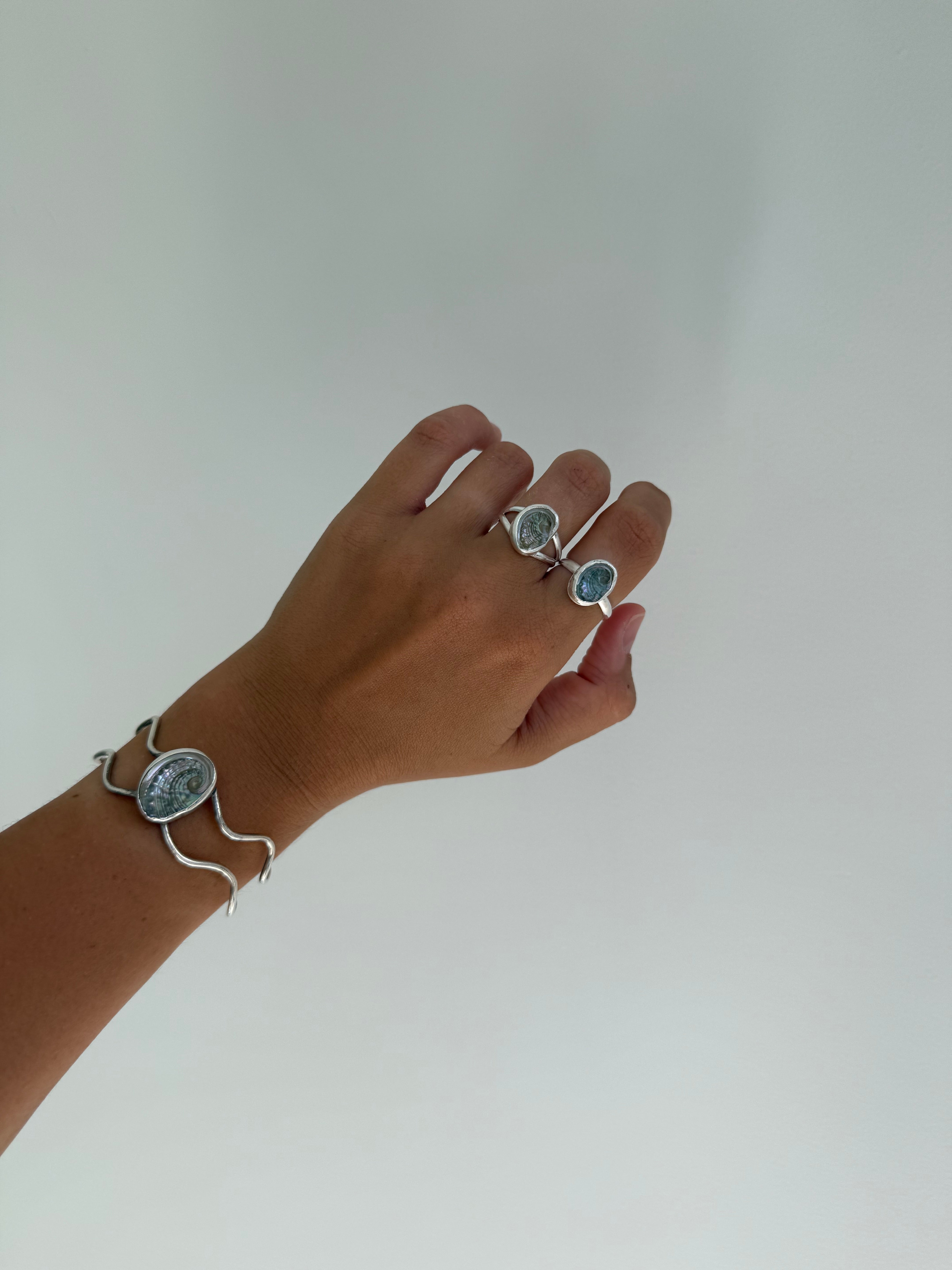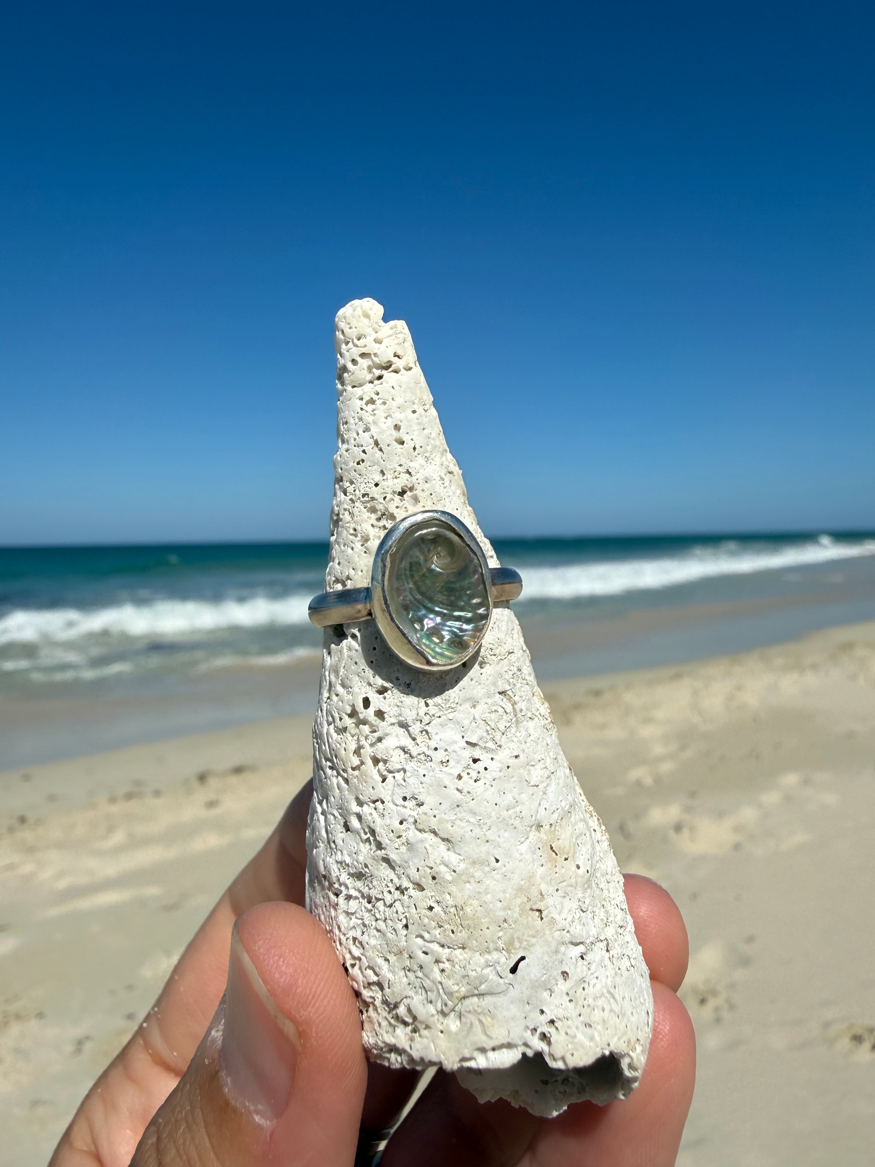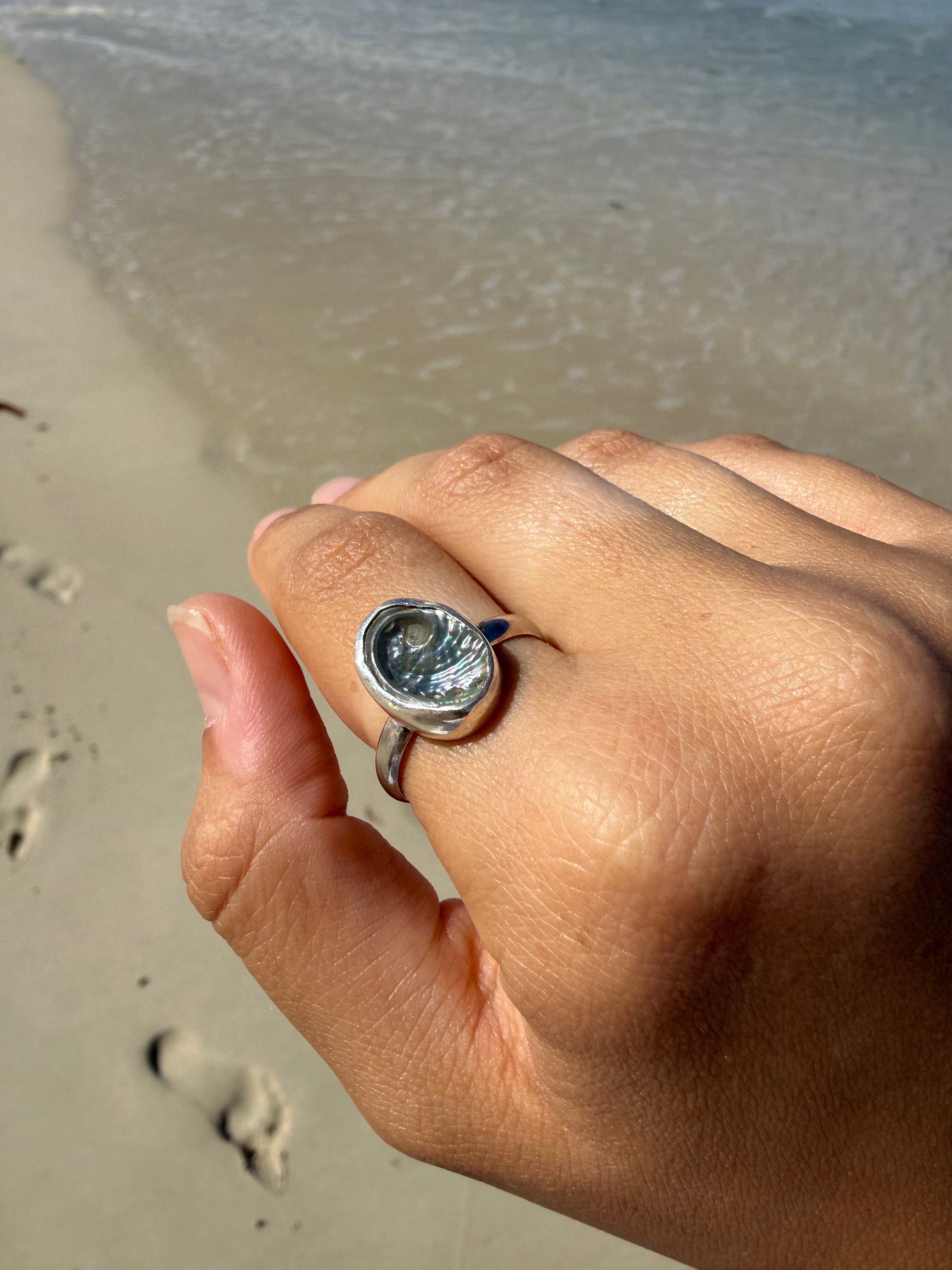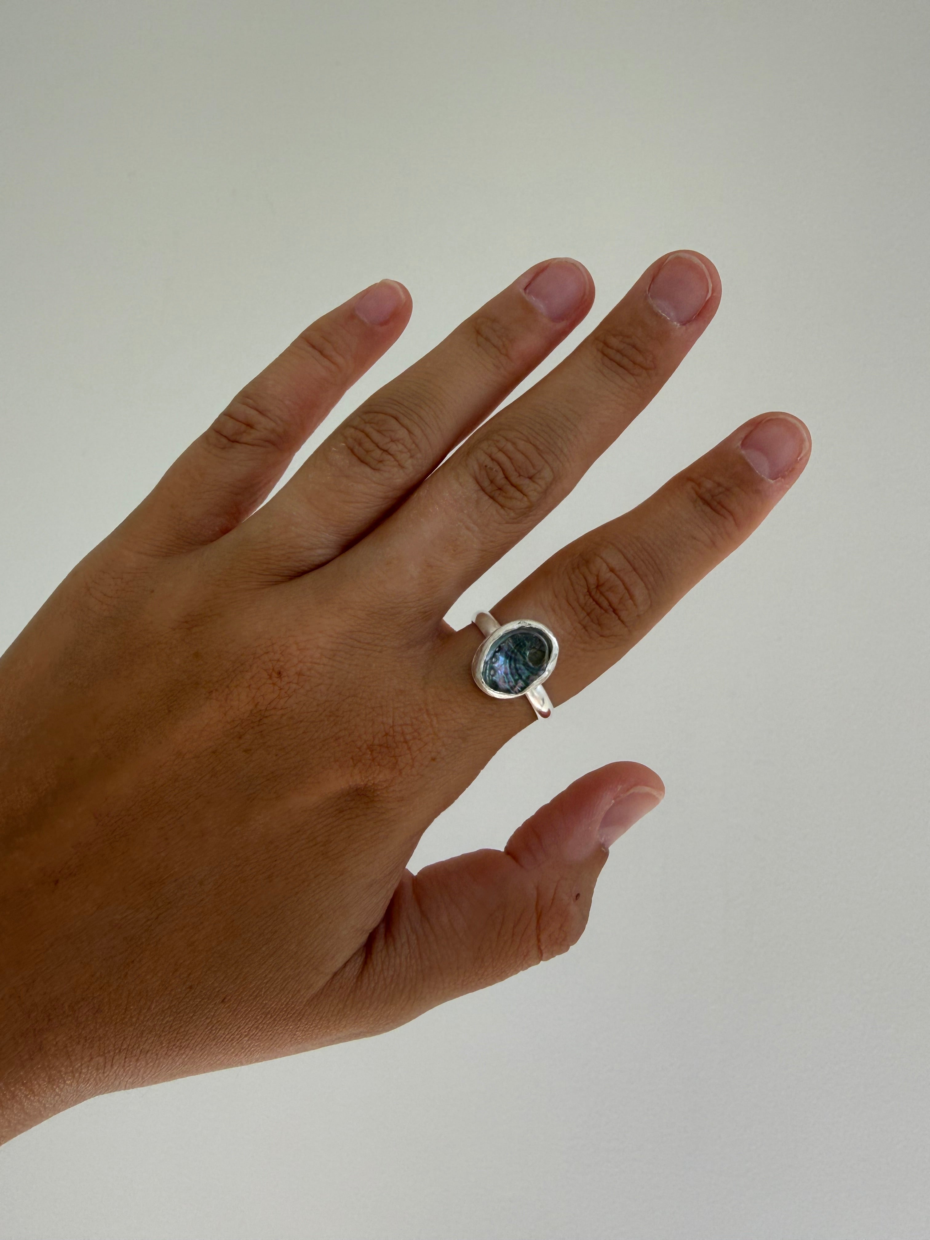 Handmade from 925 Sterling Silver featuring a baby abalone encased in resin on a plain half round band.